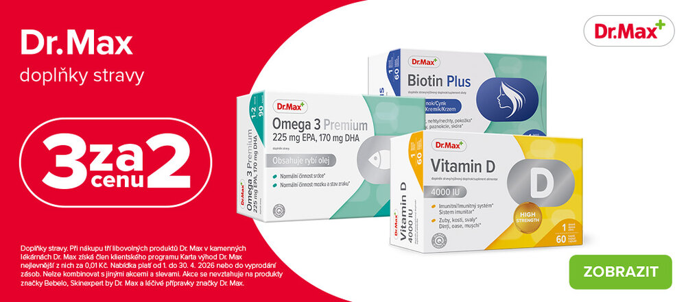 Při nákupu 3 libovolných produktů značky Dr. Max v kamenných lékárnách Dr. Max získá člen klientského programu Karta výhod Dr. Max nejlevnější z nich za 0,01 Kč. Akce se nevztahuje na Bebelo, Skinexpert by Dr. Max a na léčivé přípravky značky Dr. Max.