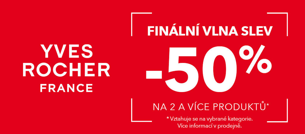 Nechte se zlákat finální vlnou zimních slev v prodejně rostlinné kosmetiky Yves Rocher a přijďte nakoupit své oblíbené produkty se slevou 50 %. Nabídka platí do 28. 1. 2026. Sleva se vypočítává z katalogových cen a nevztahuje se na dárkové balíčky a šeky. Více informací v prodejně Yves Rocher a na www.yves-rocher.cz.