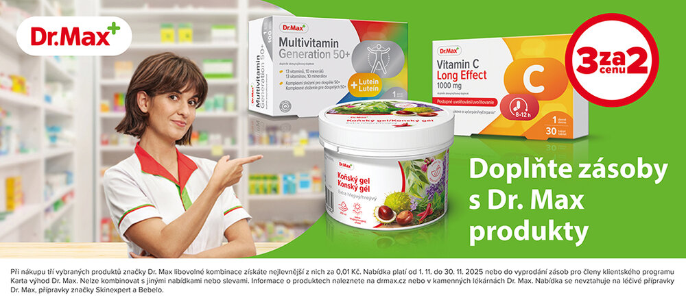 Při nákupu libovolných přípravků značky Dr. Max získá člen klienstkého programu Karta výhod Dr. Max nejlevnější z nich za 0,01Kč. Nabídka se nevztahuje na léčivé přípravky, produkty Bebelo a Skinexpert.