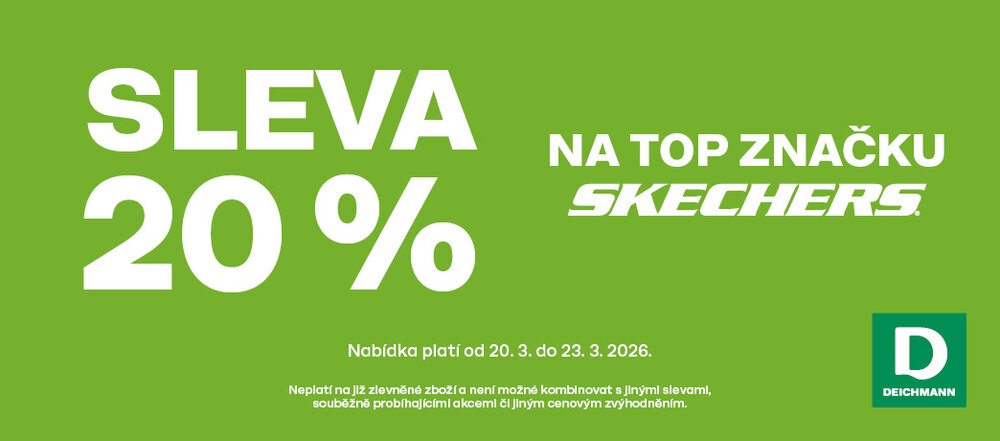 V prodejnách Deichmann právě probíhá akce – Sleva 20 % na top značku Skechers. Akce platí od 20. 3. do 23. 3. 2026.
